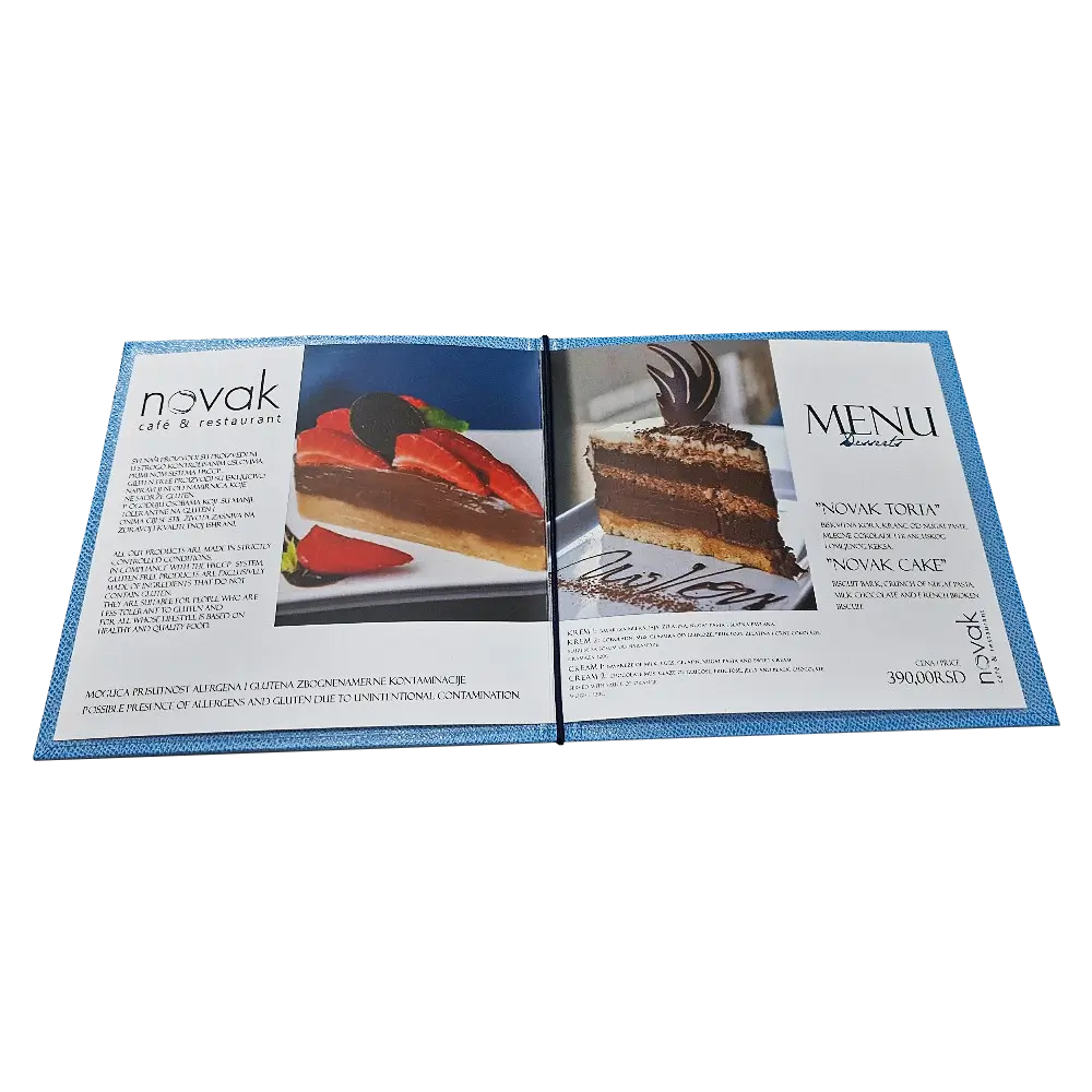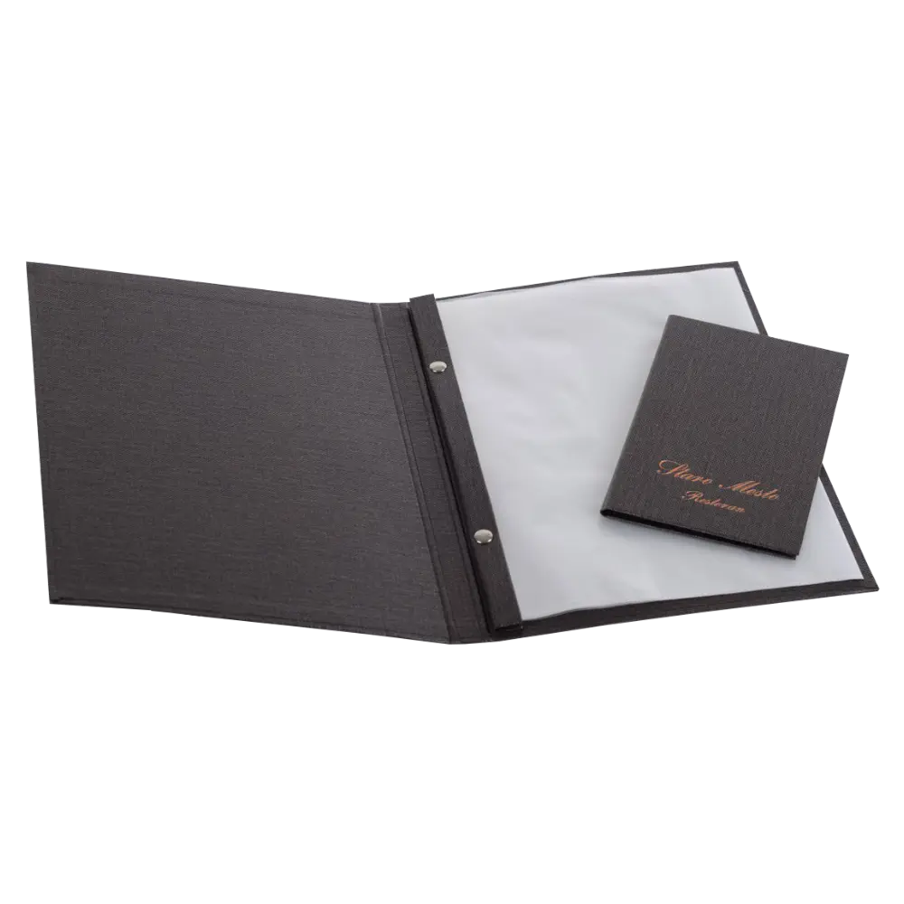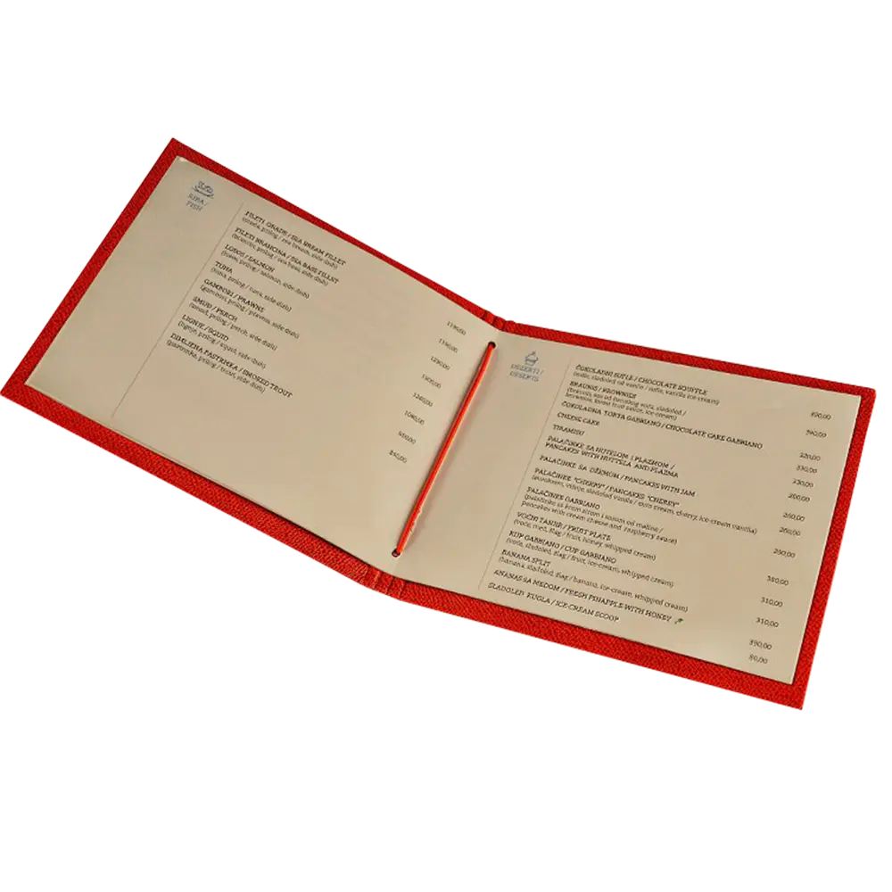 Povez s džepovima je popularno rešenje koje se često koristi. Transparentne plastične holdere-džepove pričvršćujemo nitnama ili šrafovima za korice, a unutra se lako ubacuju štampane stranice, jednostrano ili obostrano. Uobičajeno se koristi 5-8 džepova, u zavisnosti od broja artikala u vašoj ponudi. Ovaj sistem vam omogućava fleksibilnost i jednostavnost, savršen za menije koji se često ažuriraju. Ako želite efikasno rešenje za organizaciju vaših jelovnika, ovo je pravi izbor. Javite nam se i osigurajte da vaši meniji uvek izgledaju profesionalno i uredno.