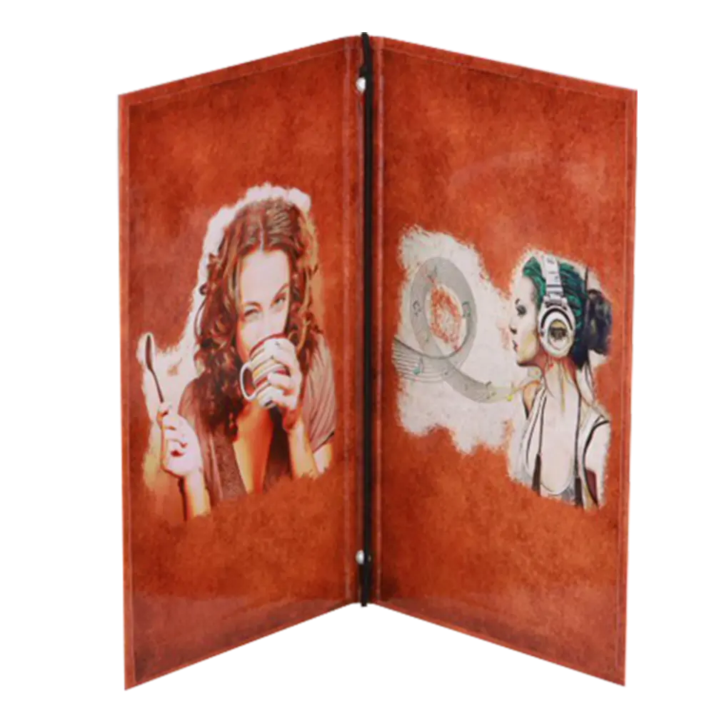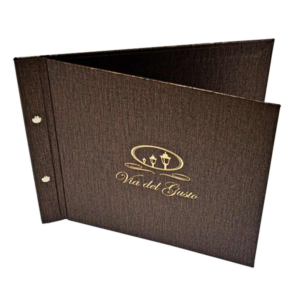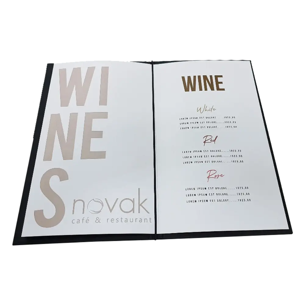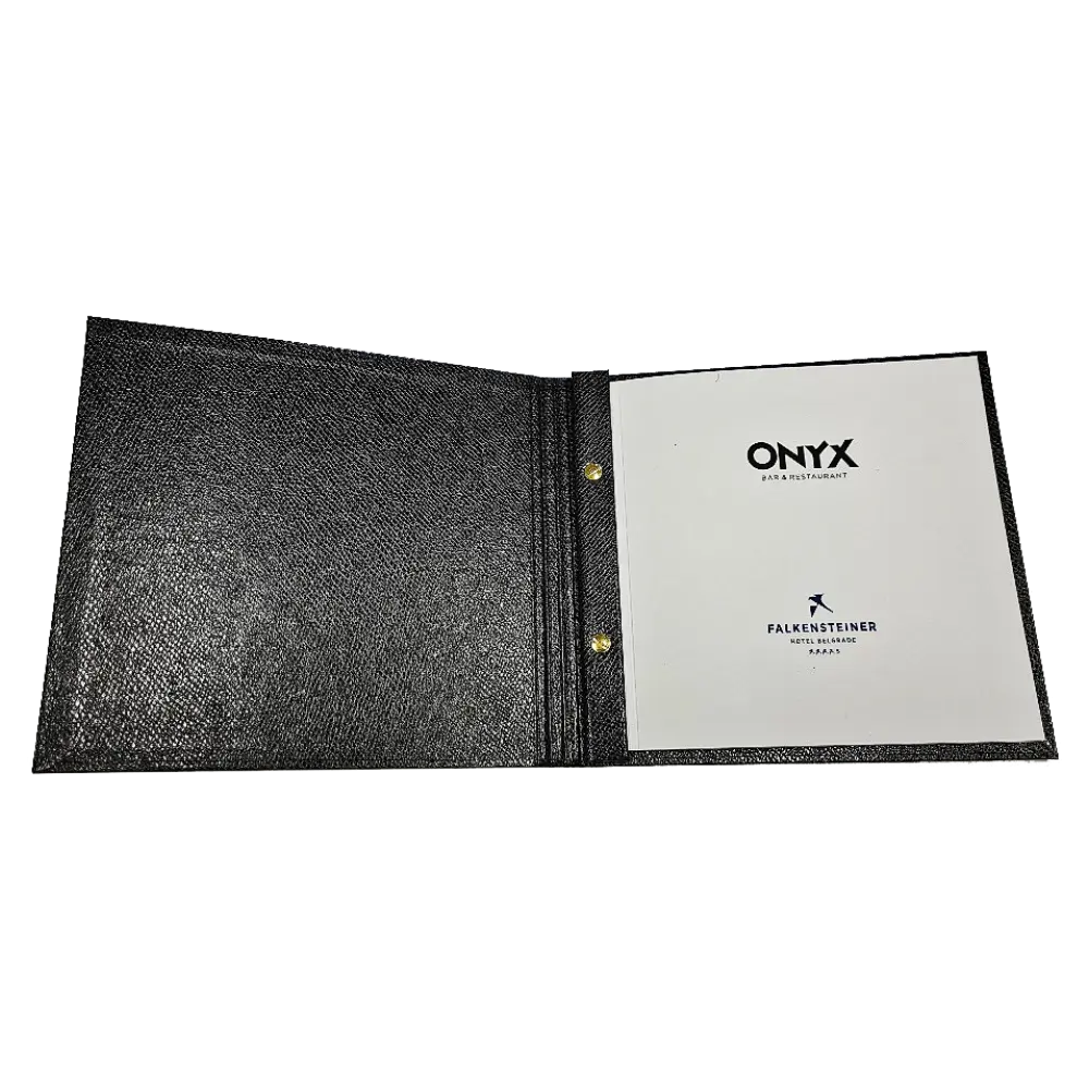 Dragi vlasnici restorana i kafića, kada izrađujete korice za jelovnik, kartu pića, dnevni meni ili korice za račune, važno je obratiti posebnu pažnju na vrstu poveza. Jedan od jednostavnijih tipova poveza koristi gumicu, ukrasnu traku ili kanap koji prolazi sredinom korica i drži listove na mestu. Ovo je idealno za jelovnike, vinske karte, dnevne menije i cenovnike. Možete birati između bušenja listova i korica ili zajedničkog povezivanja gumicom. Ukrasne trake, elastične učkure ili kanapi mogu biti različitih boja i širina, savršeno se uklapajući s materijalima poput eko-kože za vašu kartu pića, korice jelovnika ili cenovnike.